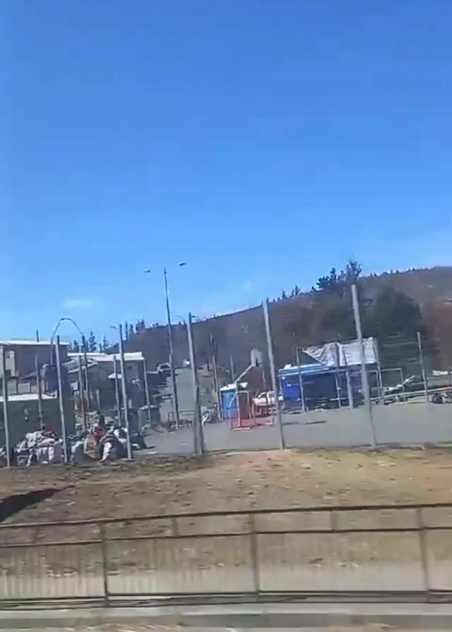 The video, shot from a moving vehicle, captures a landscape marked by destruction and aftermath. Initially, the view shows a guarded area with fencing, temporary structures, and various vehicles. The scene then shifts to the charred remains of a hillside, with burnt trees and debris. The destruction indicates a fire or other devastating event. Throughout the video, the sky is a clear blue.