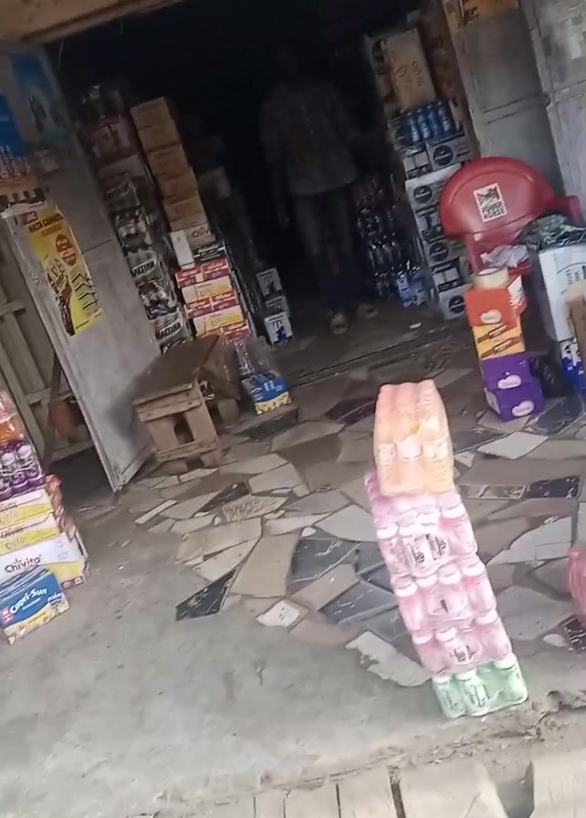 man standing in the doorway of a small store. The store appears to sell beverages and other items. The man is wearing a patterned shirt and jeans. There are several stacks of bottled drinks in front of the store. The sign above the store reads "E-VENTURES & B Distributors/General Merchant in Fruit Drinks and Wines." The floor is tiled with an irregular pattern.