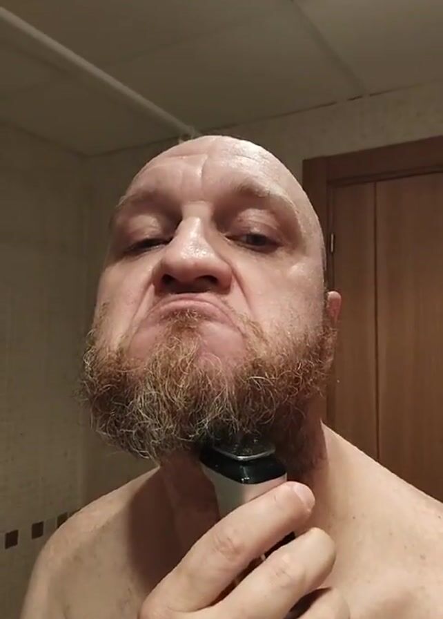 A close-up shot depicts a bald, fair-skinned man shaving his beard in a bathroom