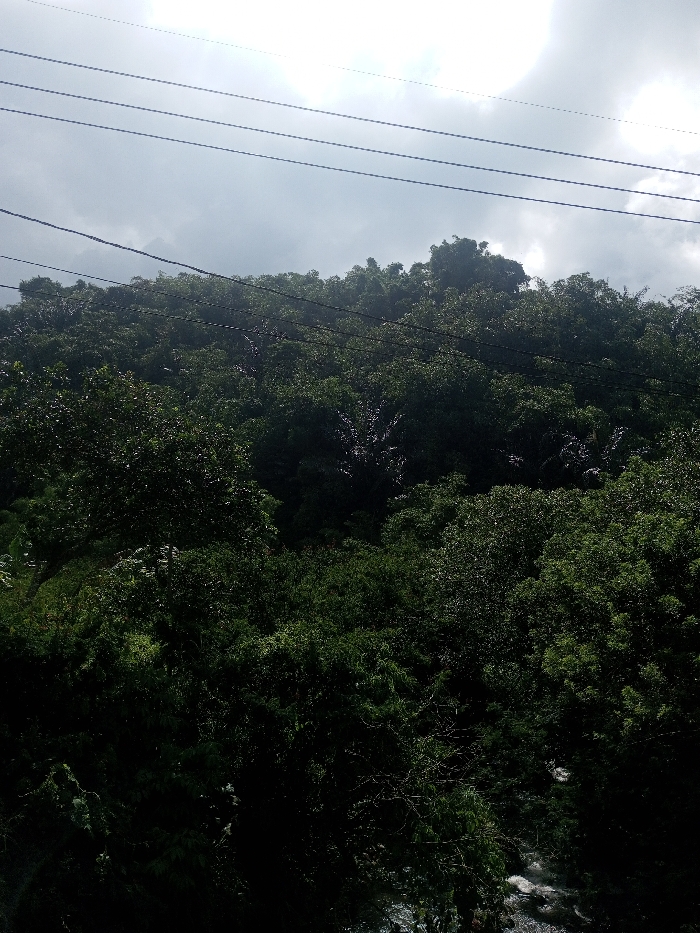 A verdant hillside is densely covered with trees, creating a thick canopy. Overhanging the trees are several electrical wires against a grey sky with hints of sunlight. The light illuminates parts of the tree cover. A stream is also visible at the bottom right of the image.