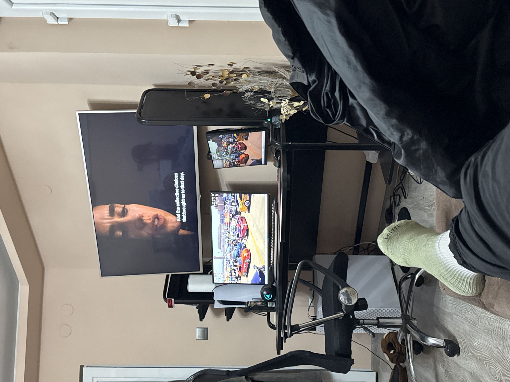 The image depicts an indoor residential setting in Varna, Bulgaria. The scene is viewed from a low perspective, with a person's left leg and foot positioned prominently in the foreground. The leg is clad in black trousers, and the foot wears a light green and white gradient "DRI-FIT" branded sock, resting on a brown upholstered surface. In the midground, a black desk is situated against a pale peach-colored wall. On the desk, a primary computer monitor displays an image of an outdoor car show, featuring multiple customized vehicles in various colors, beneath a sunny sky with numerous white tents in the background. To the left of this monitor, a white PlayStation 5 console stands vertically, accompanied by a black gaming headset with a blue illuminated logo. To the right of the main monitor, a smaller, vertically oriented monitor also displays an image consistent with a car show. A black office chair with a mesh back, armrests, and a chrome wheeled base is positioned in front of the desk. To the right of the desk, a decorative element composed of thin, dark branches and metallic, leaf-shaped ornaments is arranged in a vase. A dark, possibly black, fabric object, resembling a blanket or duvet, is partially visible along the right edge of the frame. Mounted on the wall above the desk is a large flat-screen television. It displays a close-up image of a woman's face from a video, with the English subtitle "And the collective choices that brought us to that day." A faint, blurred reflection, consistent with a person wearing a cap, is visible in the upper portion of the television screen. The room features light-colored laminate or wood flooring. A white door frame is partially visible on both the far left and far right sides of the image. A light switch is mounted on the left wall, and two distinct circular impressions are present on the upper section of this wall. A dark, rectangular object, possibly a shelf or cabinet, is positioned behind the desk setup.