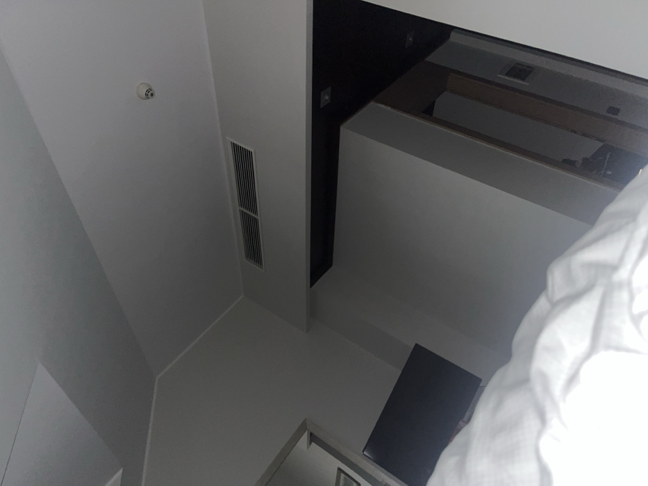 This image displays the interior of a room, presumed to be a hotel room, located in Segrate, Italy. The perspective is low, looking upwards and across the space. In the immediate foreground, rumpled white bedding is visible. A dark-screened, wall-mounted flat-screen television is positioned on a light-colored wall to the mid-left. A partially visible reflective surface is situated to the left of the television. High on a light-colored wall, a white rectangular HVAC grille is installed. Above this, a white, circular smoke detector is mounted on the white ceiling. Towards the right side of the frame, an architectural soffit with a dark underside extends into the room, leading to an open doorway or alcove. This opening reveals a darker interior space with a visible dark ceiling containing recessed lighting and a lighter wall beyond. No individuals are present.