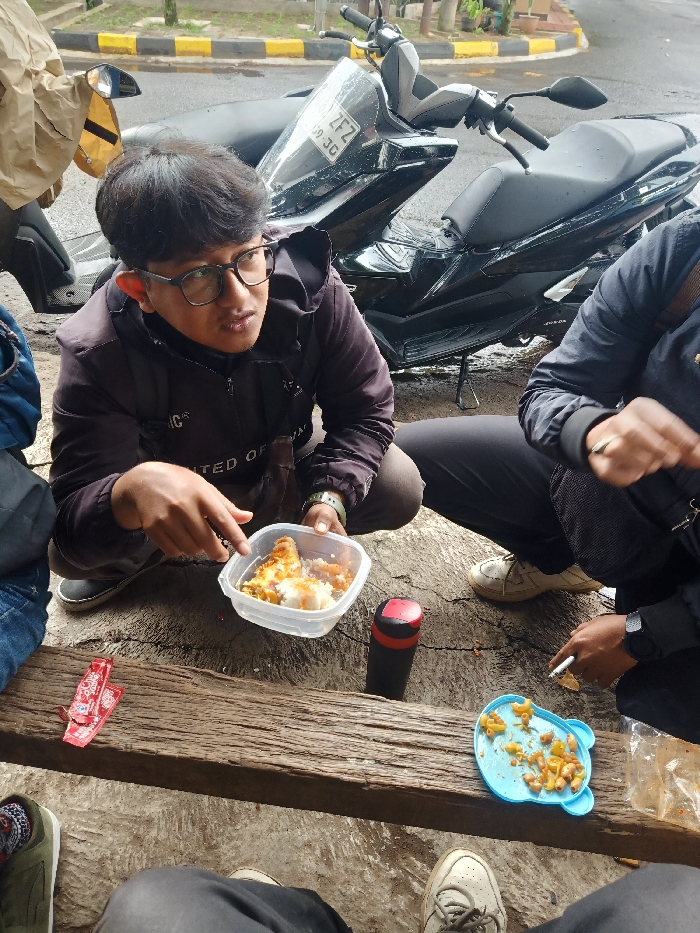 A group of people sit outdoors, likely eating a meal. A young man in glasses holds a plastic container with food, pointing at it. Another person beside him holds a cigarette. A motorcycle is parked behind them. Food spills on a blue plate, and wrappers and a water bottle lay on the wooden surface where they sit. Various shoes are visible at the bottom of the frame. The scene suggests a casual outdoor gathering.