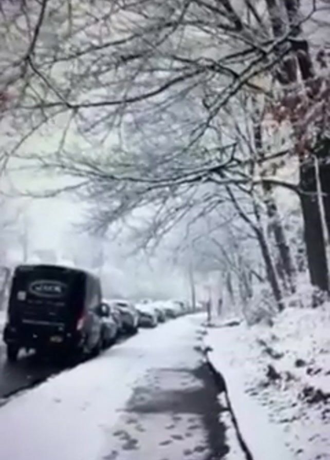 street scene in a winter setting. Trees laden with snow line the street, while a row of parked cars are visible on the left. A dark-colored van with "JMJ" written on its back is positioned at the front of the line of cars. A snow-covered sidewalk, marked with footprints, runs alongside the street. The weather appears to be snowy or shortly after a snowfall.