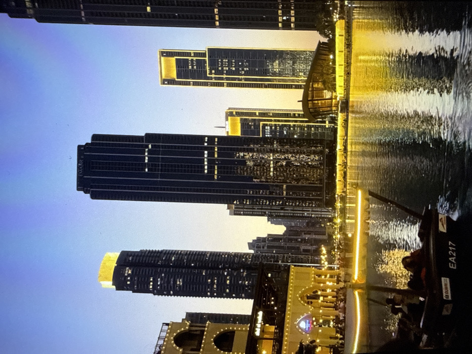 This image depicts a modern cityscape at dusk or dawn, located in the city of Lukovit, Bulgaria. A dark boat, bearing the alphanumeric "EA217" on its hull, navigates a body of water in the lower left, carrying several indistinct figures as passengers. The boat's front is illuminated by a horizontal yellow light strip, and it generates a small wake. The water surface reflects the abundant artificial lights from the surrounding structures. To the left, a multi-story building featuring arched window designs and an illuminated promenade is visible, populated by numerous blurry figures. The background is characterized by a cluster of tall, dark skyscrapers, many displaying prominent golden lighting on their upper sections and along their facades. The central, imposing skyscraper clearly shows "EMAAR" at its apex. A distinct, low-rise, modern building with a curved roofline stands on the right side of the water, reflecting in its surface.