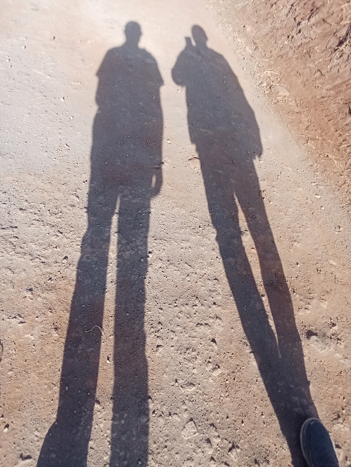 Two elongated shadows of individuals stretch across a sun-baked, dusty path. The person on the right seems to be holding a phone or camera. The shadows are dark and crisp, indicating a strong light source. The ground is uneven and appears to be a mix of dirt and small stones. A glimpse of a shoe is visible in the lower right corner. The overall tone is warm, suggesting a sunny day.
