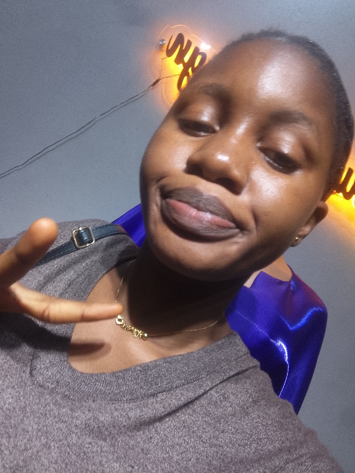 A close-up, waist-up portrait captures a young Black female, approximately 18-25 years old, making a playful facial expression. Her eyes are partially closed, lips pursed, and tongue slightly extended. She has a clear, dark complexion and wears dark lipstick. Her hair is short and dark. She is attired in a grey, possibly knitted, long-sleeved top. A thin gold chain necklace with a small, illegible gold pendant adorns her neck. A dark green or black strap with a gold rectangular buckle, likely from a bag, passes over her left shoulder. Behind her right shoulder, a vibrant, reflective blue fabric is visible. Her left hand is raised, fingers extended to form a V-sign. The background consists of a plain light grey wall. Mounted on the upper right portion of the wall is a warm orange-yellow neon sign, partially legible as "W P" or "W M". A thin dark wire runs diagonally across the upper left wall. The scene is indoors. The specific location within Onitsha, Nigeria, is not identifiable from the provided visual information.