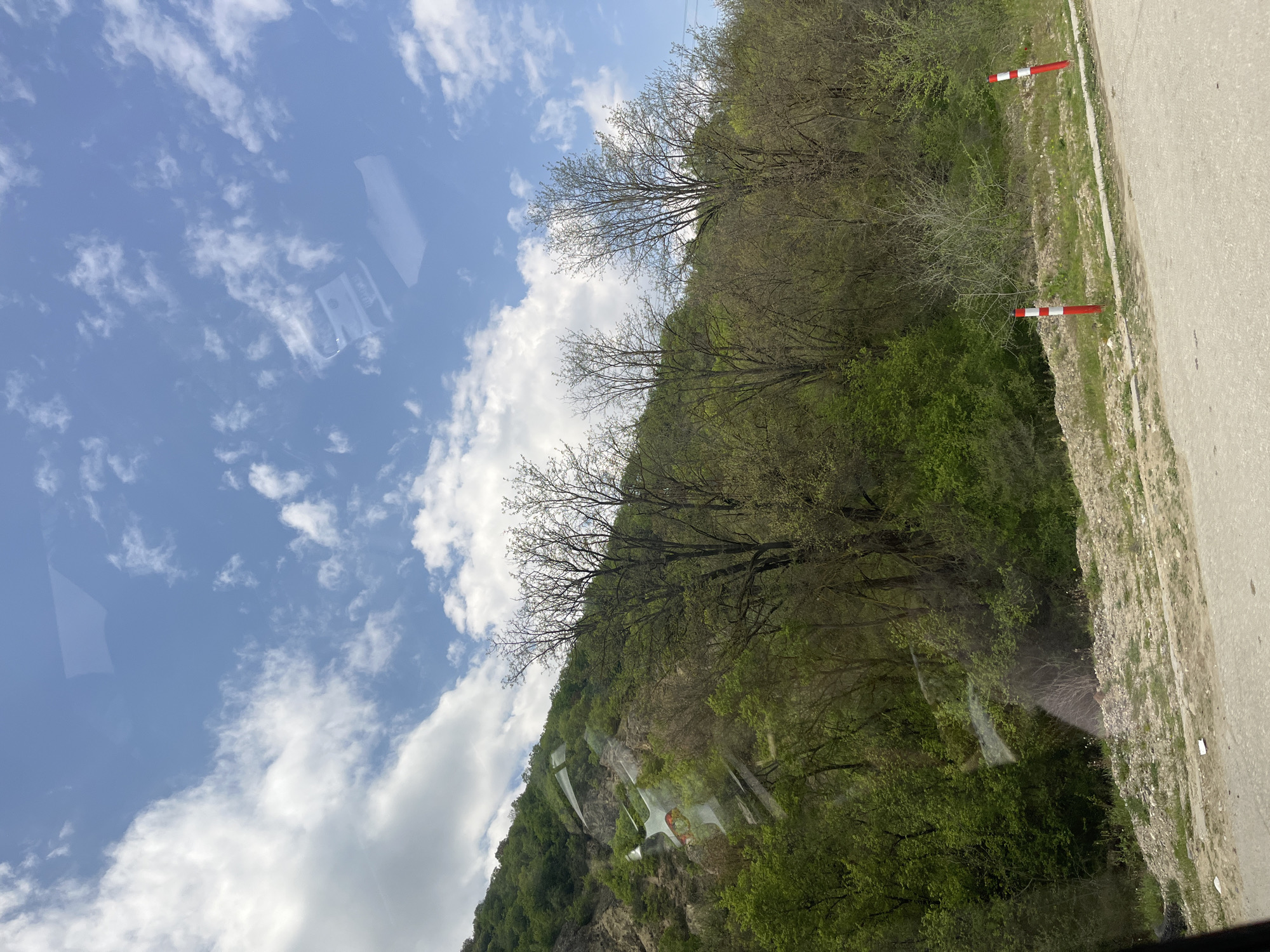 view of a hill covered in trees and vegetation, with a road and red-and-white striped poles visible along the right edge. The sky is blue with scattered white clouds. The image appears to be taken from inside a vehicle, as there are reflections visible on the left side of the frame. The location is General Todorov, Bulgaria.