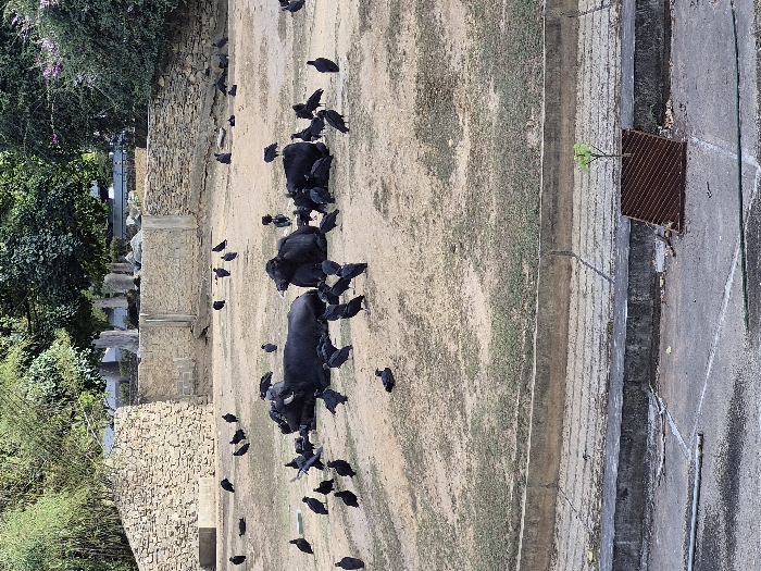 - "A gathering of black vultures surrounds several dark-colored domestic water buffalo in a sandy enclosure" by FM-I4ANH3, licensed under CC BY 4.0