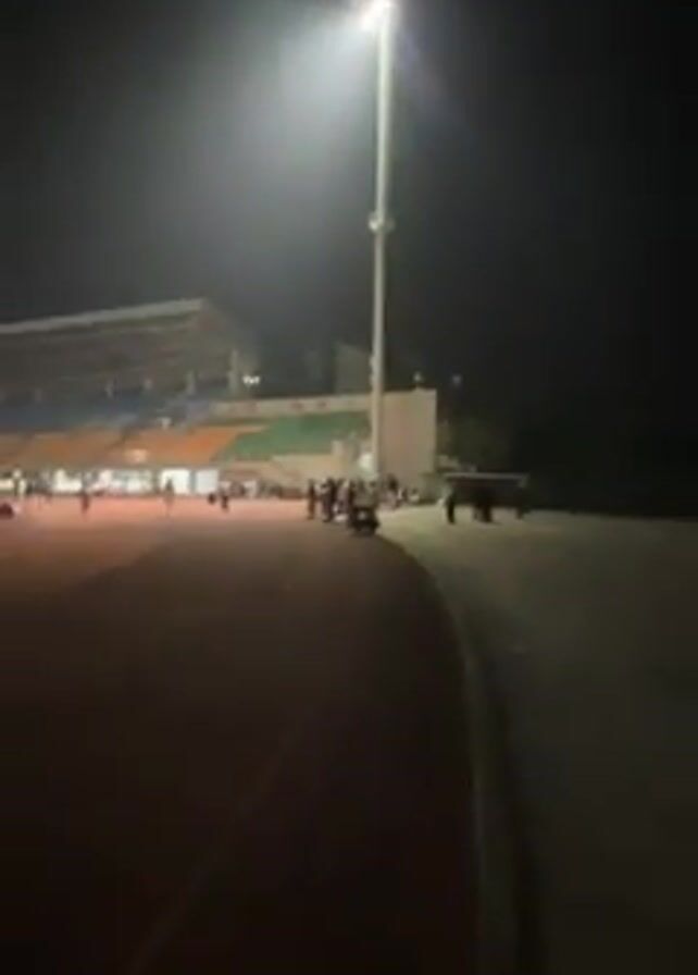 nighttime view of a stadium track. The track is red and has white lane markings. People are standing and walking along the track and in the center field. The stadium seats are green, orange, and blue. Bright stadium lights illuminate the scene. A tall light pole is visible. Some buildings are visible in the background.