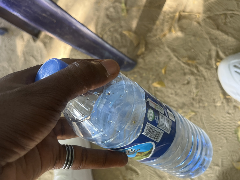 A dark-skinned hand, adorned with three silver-colored rings on the ring finger, holds a clear plastic water bottle with a blue screw cap. The bottle, partially filled with water and exhibiting external condensation droplets, features a white and blue label with "Aqua-V" visibly printed, a barcode, and discernible NAFDAC registration information. The scene's background consists of light brown, sandy ground, interspersed with scattered yellow-brown fallen leaves. A segment of a dark blue or purple plastic chair leg is visible on the right side, and the front portion of a white shoe appears in the lower right corner. The lighting suggests an outdoor environment, consistent with a general outdoor setting in Maiduguri, Nigeria, as indicated by the NAFDAC registration on the bottle and the environmental characteristics.