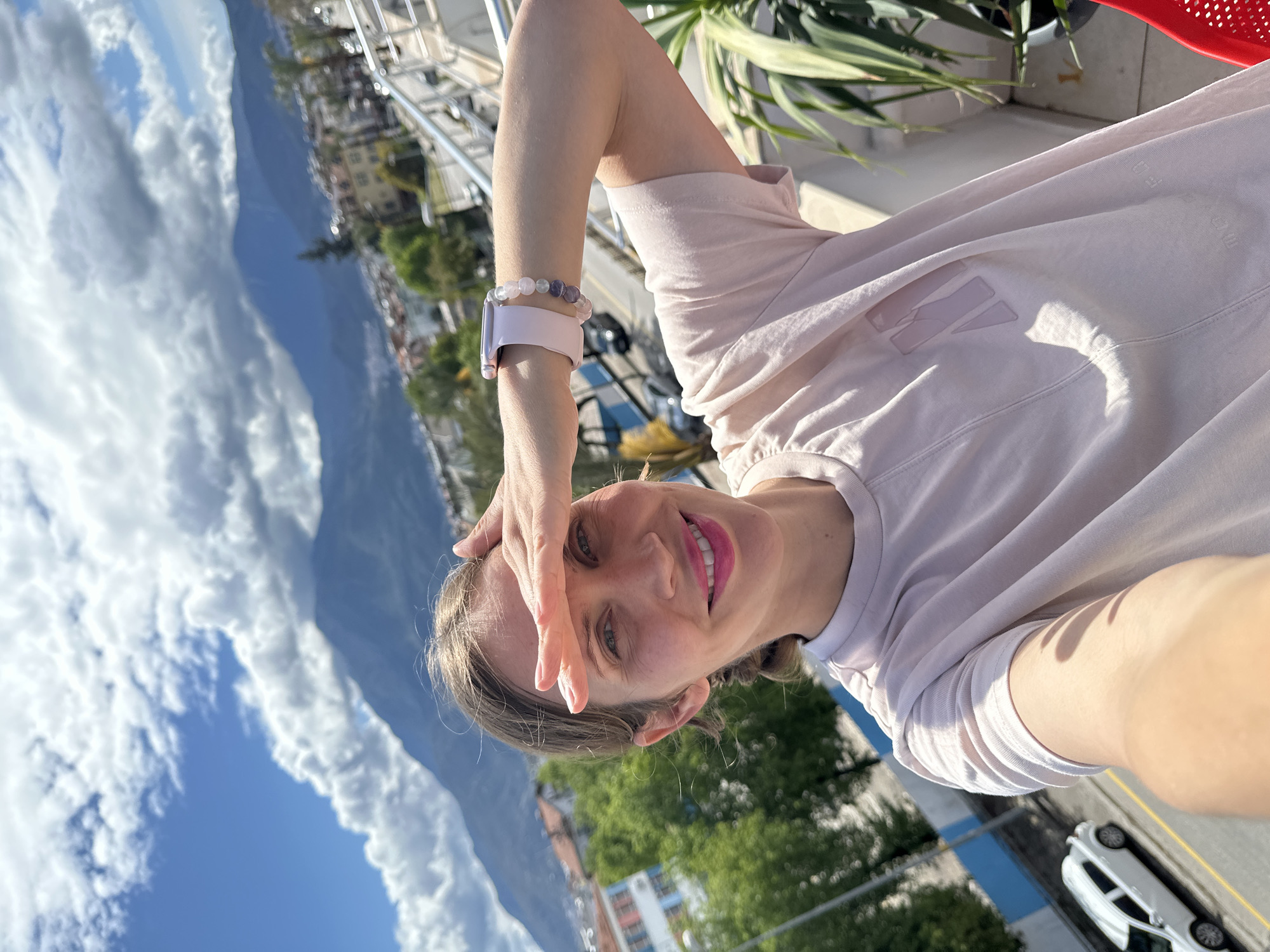 A selfie of a Caucasian woman with blond hair pulled back in a braid, shielding her eyes with her hand, wearing a pink t-shirt, an Apple watch with a pink band, and a beaded bracelet. The background shows a mountainous landscape with some clouds and city buildings and trees. The woman is outside, and based on the architectural details and the mountainous backdrop, the location appears to be in the vicinity of Fethiye, Turkey. A car is parked on the street. A potted plant sits near a red chair.