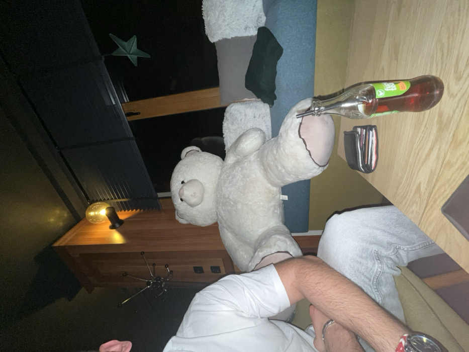 The image depicts an indoor scene at night in Pamporovo, Bulgaria. In the foreground, a partial view of a male subject is visible on the left, seated in a white short-sleeved t-shirt and light-colored jeans. He wears a red and white wristwatch and a silver bracelet on his left wrist. A light wooden table occupies the central foreground, displaying a black wallet with red accents and a clear glass bottle of "Fuze Tea" containing a dark red liquid and a black straw. Behind the table, a large, white teddy bear with dark brown paw pads and snout is seated on a blue upholstered bench. A tag is visible on the bear's lower left torso. To the right of the teddy bear, a dark green fabric item is draped on the bench, which is lined with grey and white fuzzy throw pillows. The bench is positioned against a large window fitted with dark blinds. A green star-shaped decoration hangs near the window frame. The background features dark wooden wall paneling with a multi-pronged coat rack and black electrical outlets. A wall-mounted light fixture with a spherical filament bulb illuminates the wooden paneling from above. The ceiling is dark, and the overall lighting is dim.