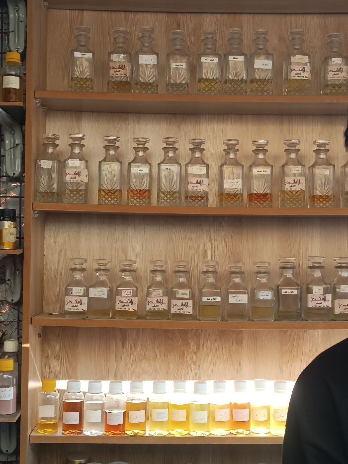 The image depicts a retail establishment specializing in fragrances, located in an unknown city and country. Four light-colored wooden shelves, approximately 12-15 inches apart vertically, are mounted against a light-colored wooden wall. The top three shelves each display a row of approximately twelve identical rectangular glass bottles with fluted sides and clear stoppers. These bottles contain liquids of varying hues, including clear, light yellow, amber, and light orange. Many bottles feature small white adhesive labels with Arabic script, some explicitly displaying "لافندر" (Lavender) and what appears to be a phone number or product code. The bottom shelf features a row of approximately eleven cylindrical plastic bottles with white screw caps, also containing liquids of various colors such as clear, yellow, amber, and light pink/orange. These bottles are illuminated from below by an unseen light source, casting a glow. Some also bear white adhesive labels with Arabic script. On the far left, a narrow vertical shelving unit or display rack is partially visible, holding a few smaller bottles, including one with a yellow cap and another with a black cap. Behind this, some metallic components or wiring are visible through a mesh-like structure. The lower right corner of the image shows the left arm and shoulder of an individual wearing a black long-sleeved garment, standing in front of the shelves. The overall scene is well-lit.