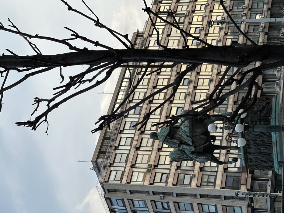 The image captures a static scene in Republic Square, Belgrade, Serbia. In the midground, the bronze Monument to Prince Mihailo is viewed from the rear, depicting an equestrian figure on horseback atop a multi-figured, relief-carved pedestal. A lamppost with two spherical white lights is partially visible to the right of the statue's base. Occupying the right foreground, a large, dark, leafless tree with numerous truncated branches stands silhouetted. The background features a multi-story building, identified as the National Museum of Serbia, with a repetitive facade of numerous windows, many of which reflect a yellowish-orange light. Multiple external air conditioning units are mounted below these windows. The building's flat rooftop supports several antennae or communication structures. The sky is overcast with light cloud cover. No individuals are prominently depicted, and no actions or interactions are discernible.