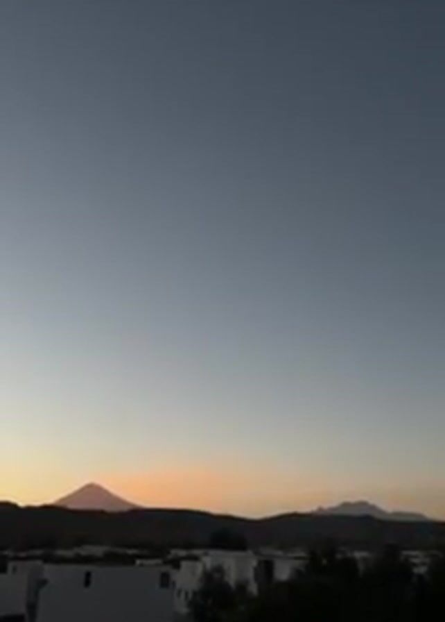 landscape at twilight, featuring a mountain in the distance, then reveals a woman holding a smartphone on a balcony