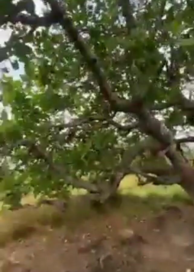 view from a hill or mountain. The ground in the foreground is covered in grass and dirt, with some small rocks. There are a few trees with green leaves framing the view. In the distance, a town or city is visible under a cloudy sky. The camera pans slightly to show different parts of the scene.