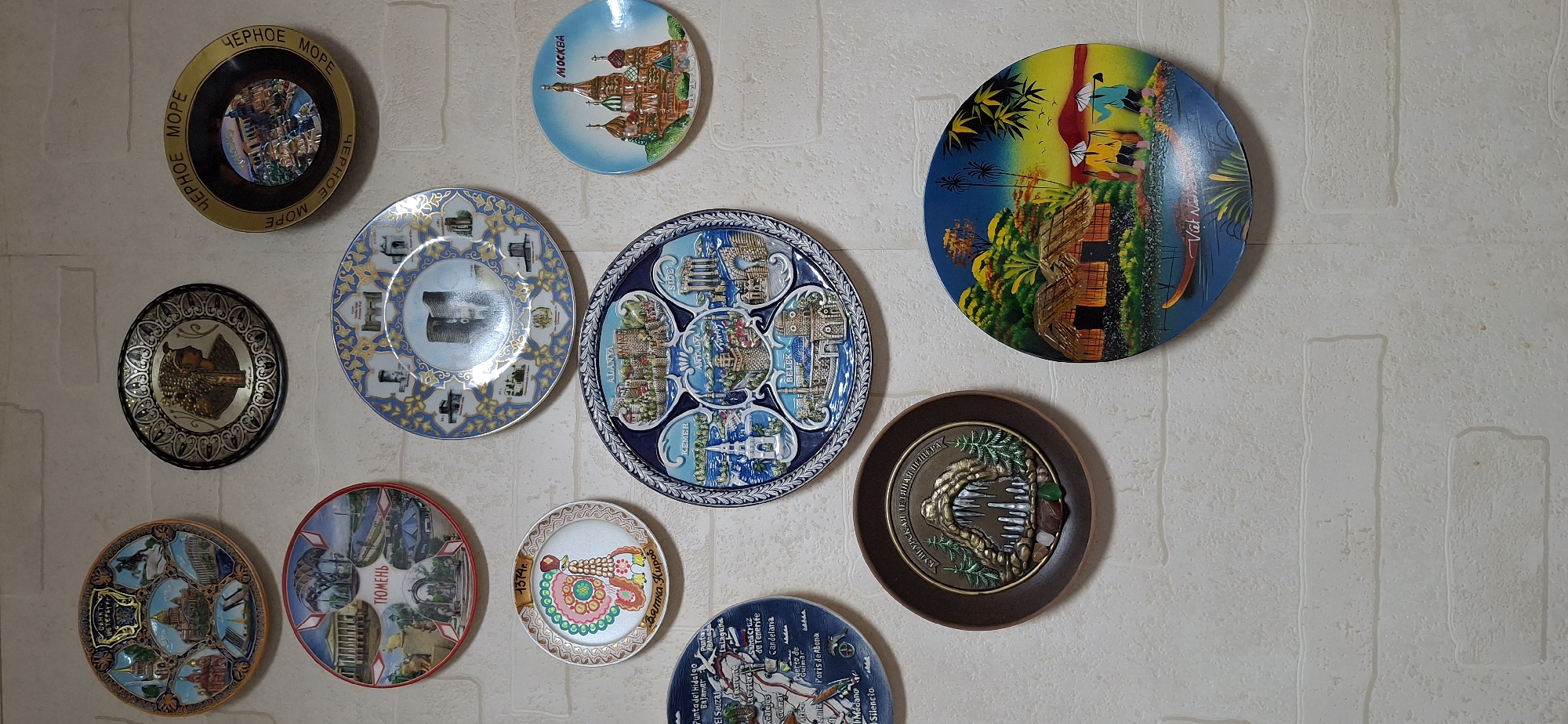 The image displays a collection of decorative souvenir plates mounted on a textured, off-white wall