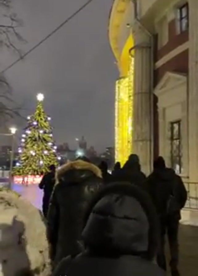 A group of people walk along a snowy sidewalk in front of a building with white columns, decorated with lights. To the left of the group is a lit-up Christmas tree. The sky is dark, and the scene appears to be at night. The people are mostly wearing dark jackets, and their backs are to the camera. The focus is on the group moving along the sidewalk. In the background, buildings can be seen in the distance.