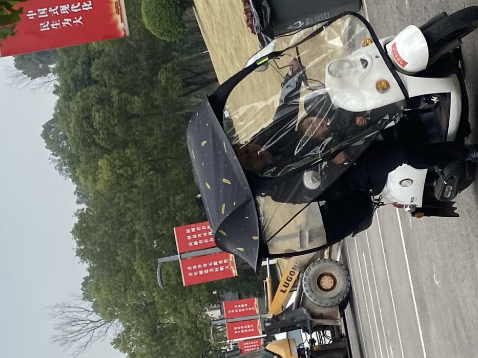 A person rides a white and black electric tricycle with a transparent, protective canopy and a black umbrella attached. The tricycle is on a paved road. In the background, there are green trees, red banners with Chinese characters, and yellow construction equipment. The sky is overcast.