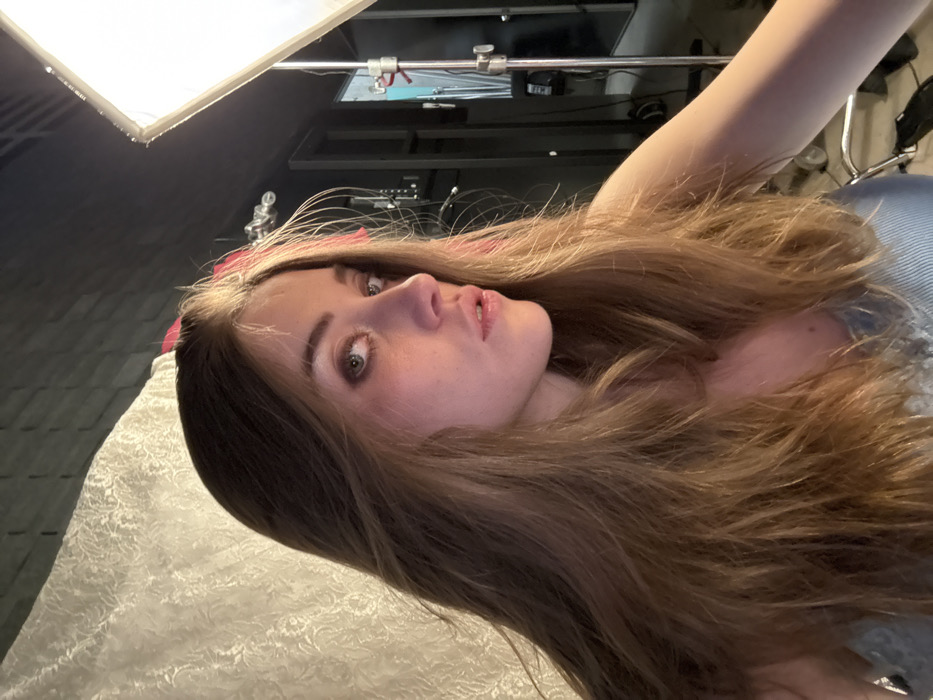 The image depicts a female individual in an indoor studio setting. The exact location within Mexico City, Mexico, cannot be determined from the visual evidence. The subject is a woman with long, light brown hair, featuring some reddish-pink strands visible near the top of her head. She has light-colored eyes, is wearing dark eye makeup (eyeliner and shadow), and lip gloss. Her expression is direct, as she looks towards the camera, angled slightly to her right. She is wearing a light-colored, possibly light blue or grey, sleeveless top with white lace trim visible at the neckline. Her right arm extends into the lower right corner of the frame, suggesting she is holding the camera. The background on the left side features a white or cream-colored textured fabric or drape with an embossed, patterned design. On the right, a large, rectangular studio softbox light, mounted on a stand, is prominently positioned. Behind the subject and the light, a dark wall or backdrop is visible, along with glimpses of additional studio equipment, including metallic stands and what appears to be a reflective surface or mirror in the deeper background. The scene is illuminated by artificial studio lighting, primarily from the right, creating highlights on the subject's face and hair.