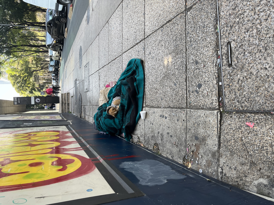- "A sidewalk scene features a person wrapped in a green and black blanket" by FM-21Qs12, licensed under CC BY 4.0