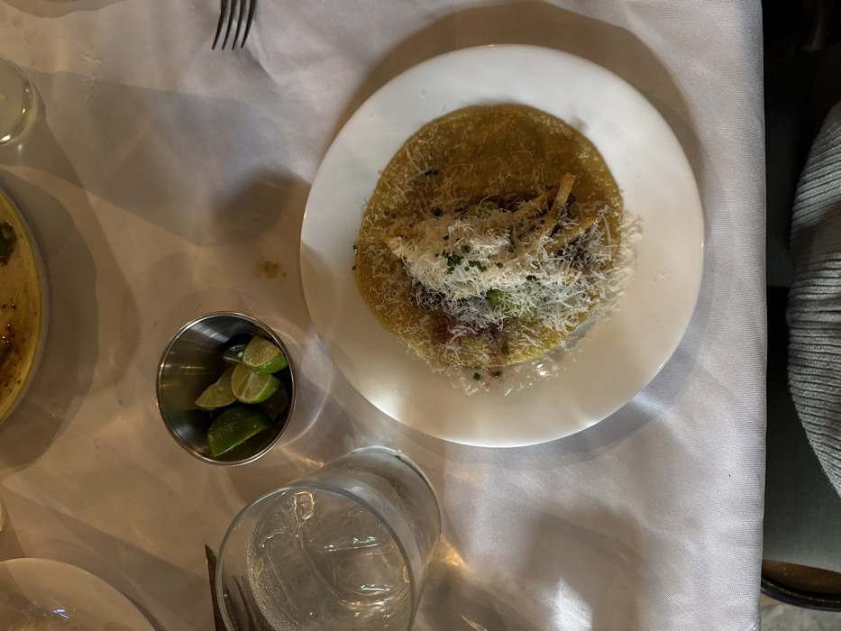 The image depicts an overhead view of a dining table in an indoor restaurant setting within Guadalajara, Mexico. The table is covered with a white wrinkled tablecloth. The primary subject is a single taco presented on a white ceramic plate, positioned in the lower-right quadrant. The taco consists of a yellow corn tortilla, topped with a substantial amount of finely shredded white cheese, green chives or herbs, and what appears to be a filling of dark, possibly braised or shredded meat, alongside reddish-purple components like pickled onions. Thin, golden-brown crispy strips, likely fried tortilla or similar, are also visible within the toppings. To the left of the taco plate, in the lower-left quadrant, a clear glass filled with water and ice cubes is present. Above the glass and slightly to the right, a small silver metallic ramekin holds numerous green and yellowish-green lime wedges. In the upper-right corner, the tines of a silver fork are partially visible. The background, out of focus, reveals portions of another yellow plate or bowl and a translucent glass. A small, irregular brown smudge is present on the tablecloth near the lime ramekin. No individuals are visible in the frame.