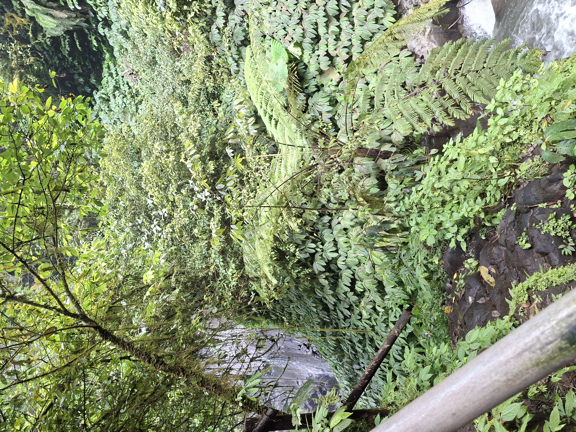 The image captures a lush, green scene, likely taken from an elevated position in Petang, Indonesia. It appears to be a view into a dense, tropical environment, possibly a ravine or near a waterfall. The frame is filled with a variety of plants including ferns and leafy green foliage. A small stream or waterfall can be seen near the top of the frame. A wooden fence or rail partially enters the lower right of the frame. A moss-covered tree branch occupies the lower left, obscuring the view into the valley.