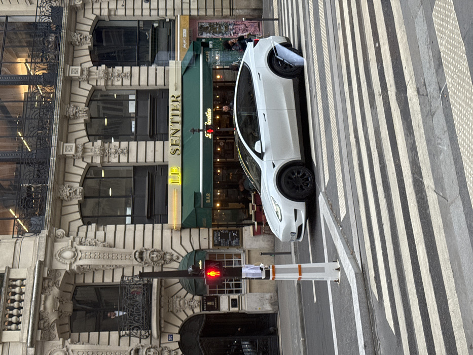 The image depicts an urban street scene in the Sentier neighborhood of Paris, France. In the foreground, a prominent black and white striped pedestrian crossing occupies the lower portion of the frame. A grey curb separates the roadway from the sidewalk. To the left, a tall, grey pedestrian signal pole displays a red "standing man" light, indicating a "do not walk" signal. A white Tesla Model Y with black wheels is positioned on the street, partially covering the pedestrian crossing, angled slightly towards the right side of the frame. A noticeable white, somewhat reflective object or piece of debris is attached to or protruding from the vehicle's rear passenger side. In the background, a multi-story Haussmannian-style building with an ornate stone facade dominates the scene. The ground floor features a cafe or bar named "LE SENTIER," marked by a yellow illuminated sign above a green awning. Through the large windows, red-cushioned chairs and tables are visible, with several patrons present inside. To the left of "LE SENTIER," another building entrance features signs for "BOE+VI" and "CHAMPA**." The upper floors of the building display large windows with black frames and numerous decorative elements, including carved faces (mascarons) above the windows and ornate stone balustrades. On the second floor, a person in a light shirt and dark vest is visible standing on a small balcony to the far left. On the street level, an individual with dark hair and a beard is partially visible behind the Tesla near the cafe entrance, and another person with curly dark hair is further right on the sidewalk. The overall lighting suggests either a cloudy day or dusk, with the cafe's interior lights illuminated.