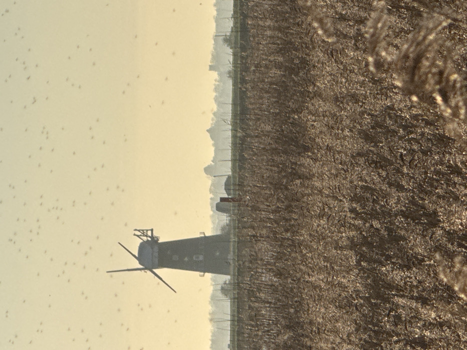 The image displays a rural landscape within the Broadland district of Norfolk, United Kingdom, specifically featuring Strumpshaw Mill. The foreground is occupied by a dense field of tall, dried reeds, presenting a golden-brown hue and extending from the bottom of the frame to the mid-ground. A prominent dark, conical windmill with four stationary sails, consistent with a drainage mill, stands in the middle ground, positioned slightly left of center. To the right of the windmill, two smaller, dark, low-profile structures and a thin, red vertical post are discernible amidst the reeds. A faint line of distant trees or vegetation marks the horizon. The sky is a hazy, pale yellow-orange, indicative of low-angle sunlight or atmospheric conditions, and contains numerous small, dark specks identified as flying birds. On the far right, a distant church spire is faintly visible against the horizon. No individuals are present in the scene.