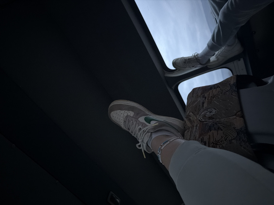 The scene depicts the interior of a vehicle, likely a bus or large van, with a view to the exterior through a window. The specific location within Hrabarsko, Bulgaria, is not discernible from the image. In the foreground, a person's left leg is elevated, with the foot resting on a patterned fabric seat headrest. The person wears light-colored trousers, white socks, and a light grey sneaker featuring a green swoosh. A multi-colored beaded anklet is visible on the left ankle. The interior lighting is dim. In the midground, seen through a framed window with a rounded top, another person's lower legs and feet are elevated, resting on the window frame. This individual wears light-colored trousers, white socks, and white sneakers. The exterior environment visible through the window consists of an overcast sky and a dark horizon line, suggesting a distant landmass or mountains under subdued, cloudy conditions.