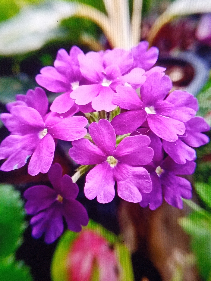 A cluster of vibrant magenta flowers with five rounded petals each, dominates the frame