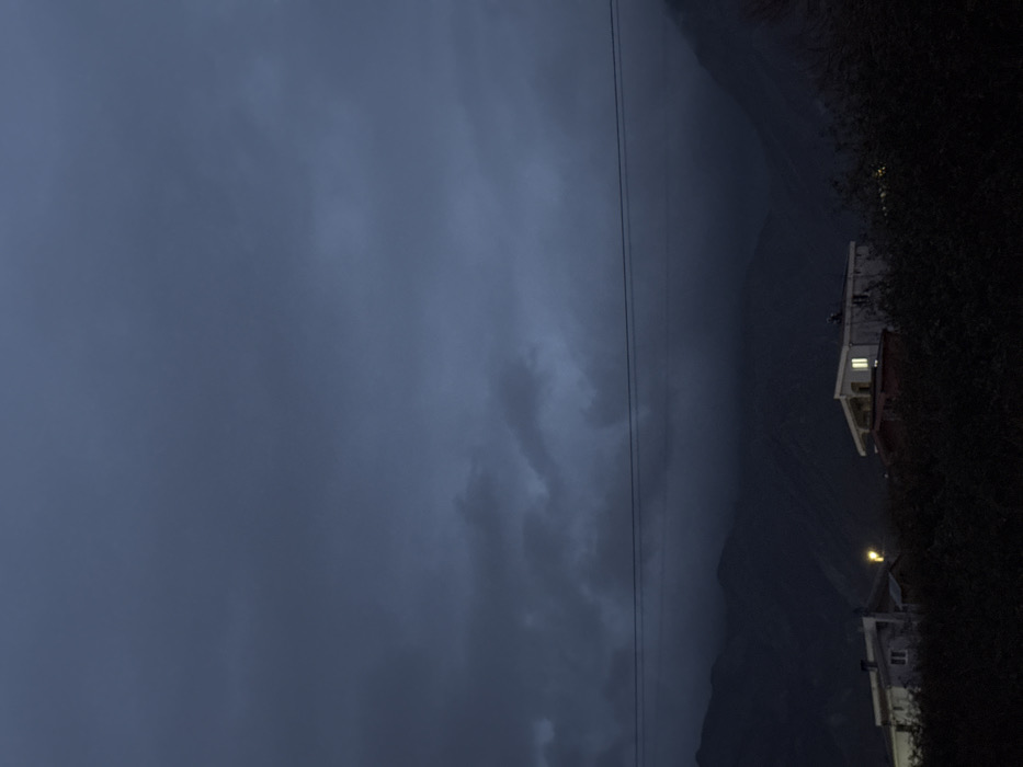 A night scene depicts a somber sky filled with heavy, dark clouds, suggesting an impending storm. A power line cuts through the landscape. On the right, two houses are barely visible, shrouded in darkness and foliage, with faint lights emanating from their windows. A hill or mountain rises in the background, blending with the night. The overall impression is one of gloom and a potentially stormy atmosphere.