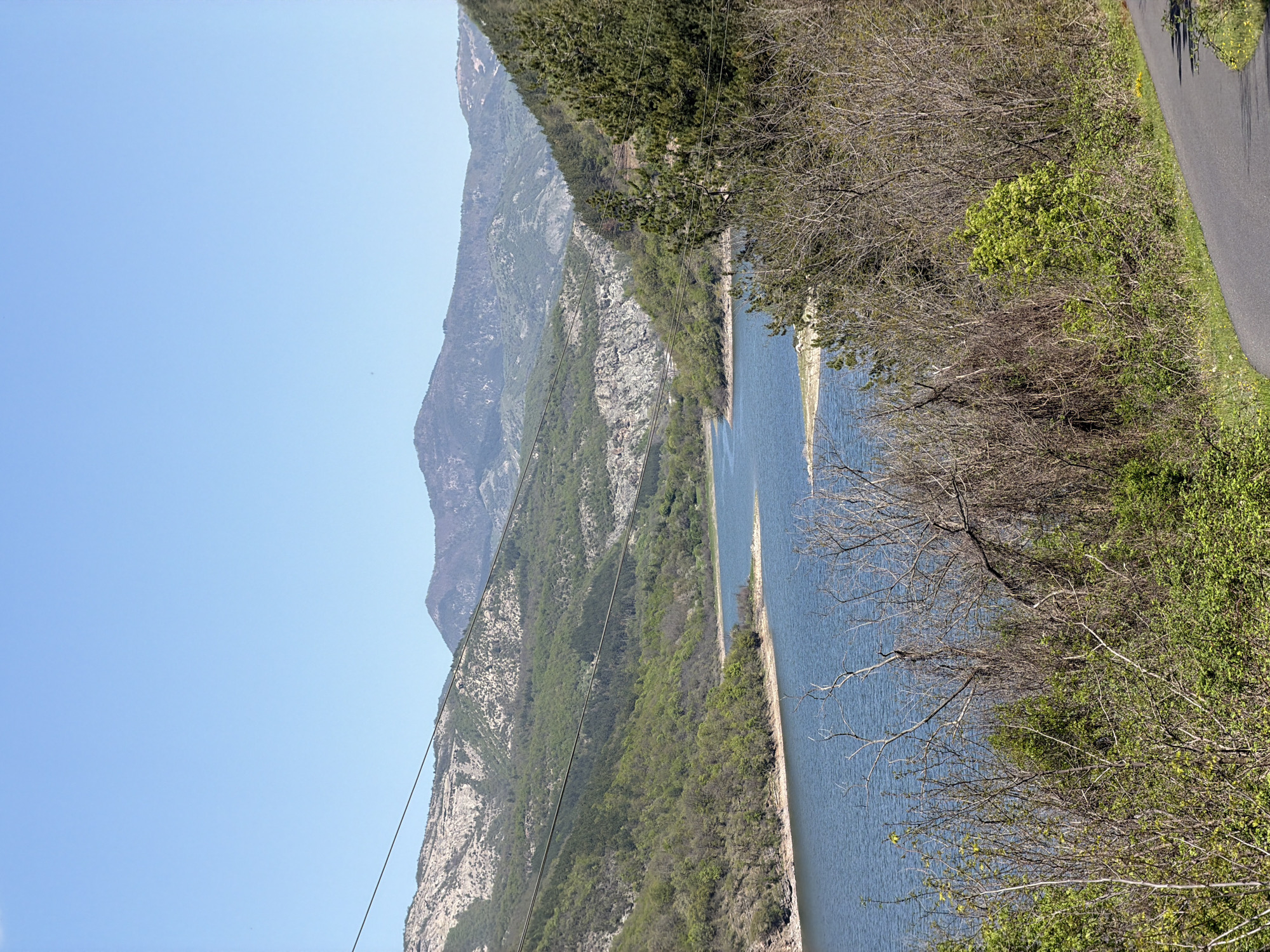 A vertically-oriented image shows a view of the Tsonevo reservoir near the village of Padartsi, Bulgaria, set against a landscape of rugged mountains under a clear blue sky. The reservoir, a wide body of water, occupies the lower half of the frame and separates the mountain slopes on either side. The mountains feature sparse vegetation, with exposed rock faces and patches of green trees and shrubs. A road runs along the shoreline. Bare branches and budding trees dominate the immediate foreground.