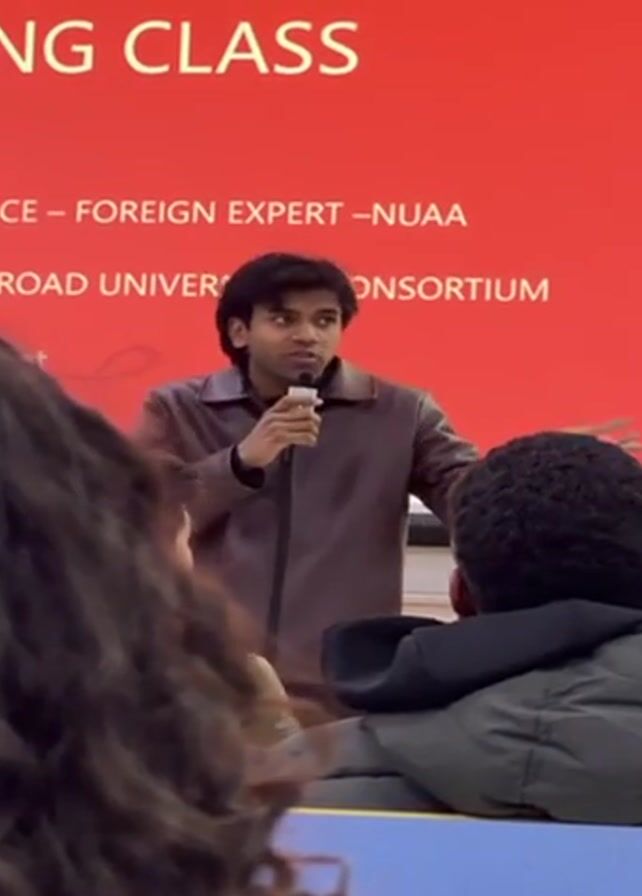man speaking into a microphone in front of an audience. He is wearing a brown leather jacket and has dark hair. Behind him is a red screen with white text that reads "ING CLASS," "PLACE - FOREIGN EXPERT - NUAA," and "LKROAD UNIVERSITY CONSORTIUM." The audience consists of people with varying hairstyles and clothing. Some are looking at the speaker, while others are looking elsewhere. The overall setting appears to be a classroom or lecture hall.