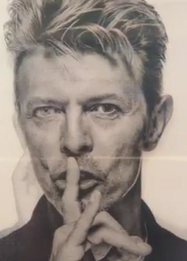 drawing of David Bowie. In the first few frames, he has his finger to his lips in a "shhh" gesture. The image then changes to show him without the finger to his lips. The drawing is in black and white. He has blond hair. He is wearing a suit.