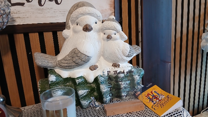 The image depicts an indoor domestic scene located in Spijkenisse, Netherlands. A white ceramic figurine of two birds wearing Santa hats is centrally positioned on a white crocheted lace tablecloth. The larger bird on the left and a smaller bird on the right feature gray wing accents, brown beaks, and a glitter finish, resting on a base molded to resemble snow-covered green evergreens. A clear acrylic plaque attached to the base displays partially legible text including "P Thank you" and "PASTOR". To the left of the figurine, a clear glass candle holder contains white wax, and a portion of a spherical silver metallic ornament is visible. To the right, a yellow book with an illustrated cover lies open, its text illegible. The background consists of vertical wooden wall panels, alternating light wood grain with dark brown or black sections. A segment of a dark blue vertical structure is visible behind the figurine on the right. A white, possibly floral, decorative element is partially visible on the far right edge of the frame. A white sign with dark cursive text is partially visible in the upper left background.