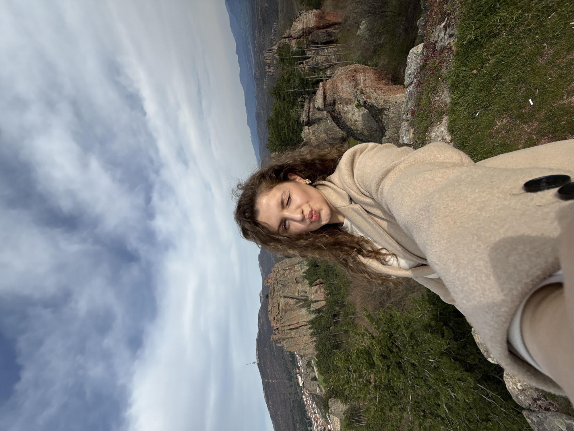 A selfie shot depicts a young woman with curly brown hair, light skin, and light-colored coat, puckering her lips for the camera. She's positioned on a rocky terrain with green grass and foliage. The backdrop showcases the Belogradchik Rocks, a unique rock formation near the town of Belogradchik, Bulgaria. Behind the rocks are mountains and a sky filled with clouds. The photo appears to have been taken during the daytime.