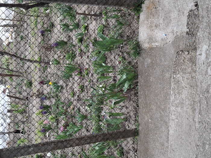 The image depicts an outdoor scene in Krupnik, Bulgaria, showing a garden plot viewed from a concrete foreground. The immediate foreground consists of two distinct, weathered concrete surfaces, appearing as steps or a tiered path, exhibiting rough textures and some minor surface irregularities. A narrow band of green grass and small weeds grows where the concrete meets the soil. A black chain-link fence, featuring diamond-shaped mesh, runs horizontally across the midground. A dark, rough-barked wooden post, likely serving as a fence support, is prominently visible on the left side, with a small black, cylindrical object attached to its upper section. Behind the fence, a garden bed with light brown soil contains various plants in different stages of growth. Numerous hyacinths are in bloom, displaying prominent purple, pink, and yellow flowers, interspersed with smaller white flowers. Numerous broad, bright green shoots, indicative of emerging bulb plants, are also visible. Several thin, dark wooden stakes are scattered vertically within the garden plot. The background is out of focus, revealing blurry, light-colored structures, possibly covered with white or translucent material, situated beyond the garden area. No individuals or animals are present.