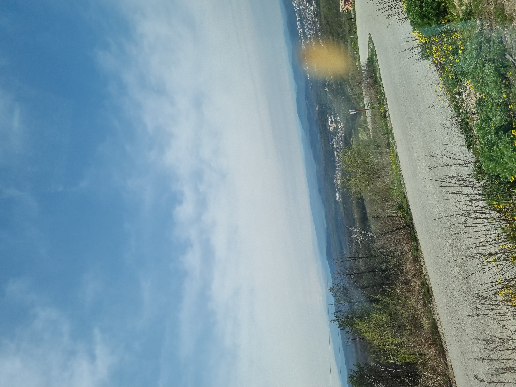 landscape in Arbanassi, Bulgaria. A narrow road with vegetation including yellow flowers lines the right side of the frame. Beyond the road, the terrain slopes downwards, revealing scattered buildings amidst green hills and valleys. The sky, with scattered clouds, fills the left side of the image. The horizon is obscured by a light haze.