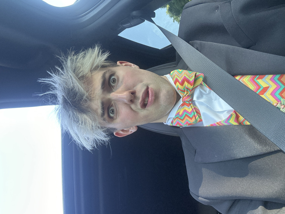 young man in a black suit with a white shirt and colorful bow tie, sitting in the front seat of a car. The man has blonde hair with a spiky style and looks concerned with a slightly open mouth. He is wearing a black suit jacket, a white shirt, a colorful patterned bow tie, and a matching colorful patterned waistcoat. He is wearing a black seatbelt, which is fastened across his chest. The car's interior is visible in the background. The sky is blue, and trees can be seen through the rear window of the car. The image was taken inside a vehicle in the city of Minskip, UK (latitude: 54.066, longitude: -1.39), which is located in North Yorkshire.
