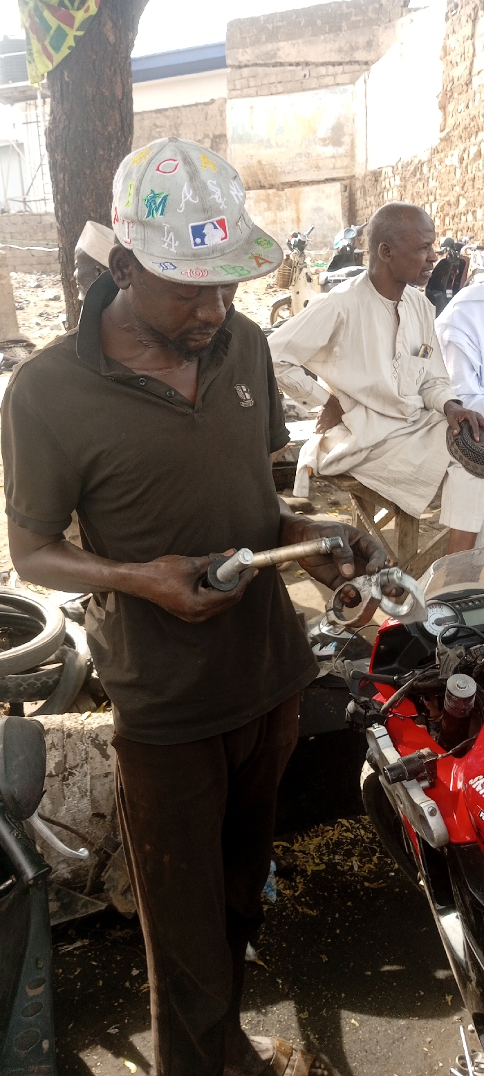The scene is an outdoor setting, likely a roadside service or repair area, in Fagge D2, Nigeria, under bright daylight