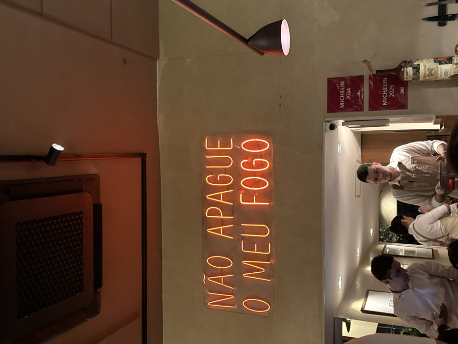 An interior shot shows a neon sign reading "NÃO APAGUE O MEU FOGO." A spotlight shines above the sign. Michelin awards for 2024 and 2025 are visible. Restaurant staff are visible inside the space. A vent is also visible on the left.