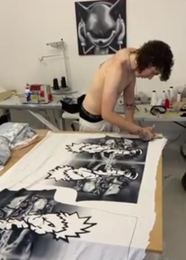 A shirtless young man with curly brown hair stands at a table, cutting white fabric with a black and white design