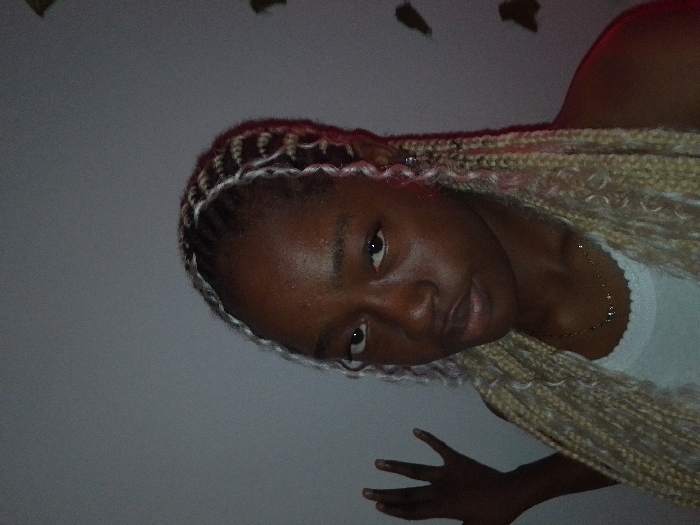 The image displays a single female subject with dark skin, positioned indoors against a plain, light-colored wall. Her gaze is directed at the camera. Her hair is styled in cornrowed braids at the scalp, transitioning into long, light blonde or cream-colored box braids and extensions that frame her face and extend over her shoulders. A reddish ambient light illuminates the subject's right side, affecting her hair and shoulder. She is wearing a white sleeveless top with a lace-trimmed neckline and a delicate, gold-toned chain necklace adorned with small, dark, spaced beads. A small, circular, silver-toned earring is visible in her right ear. Her left hand is raised, open, and positioned against the wall to the upper left of her head, with fingers extended. Two dark, leaf-shaped decorative objects are faintly visible on the wall to the right of the subject. The specific location within the city of Ado, Nigeria, cannot be ascertained from the visual content of this image.