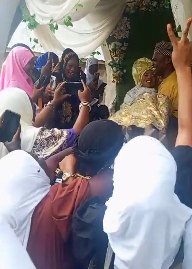 Certainly! Here's a description of the video: The video captures a wedding celebration where a man in a yellow shirt and traditional cap is carrying a woman in a gold and white outfit. They are surrounded by guests who are holding up their phones to take pictures and videos. The couple is seated in a decorated area with white drapes and floral arrangements. People are smiling and appear to be celebrating, with some raising their hands in the air.