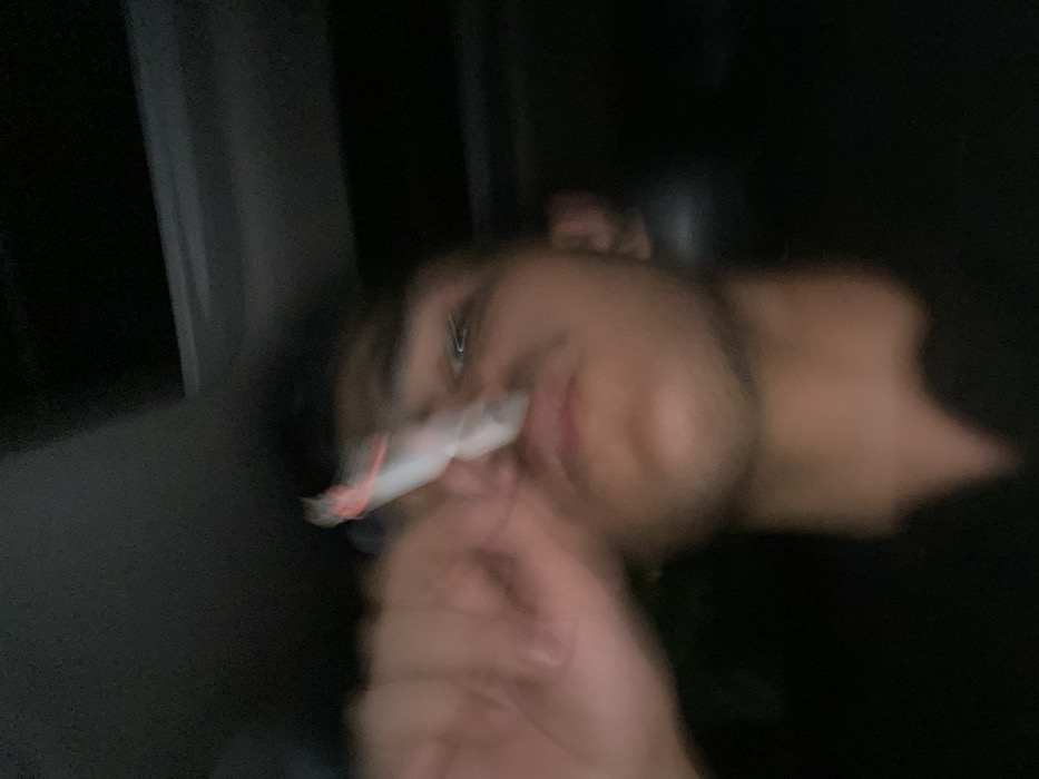 The scene is situated in At-Tall, Syria. The blurred, low-light image captures an individual, likely male, from the chest up, looking towards the camera. The subject's face is largely indistinct due to motion blur, though general facial features are discernible. The right hand, centrally positioned, holds a hand-rolled object, consistent with a cigarette or joint, between the thumb and forefinger. The object's tip is glowing, indicating it is lit, and a reddish-pink band is visible around its circumference. The background is dark, suggesting an enclosed interior space, possibly a vehicle cabin given a faint upper contour resembling a sunroof.