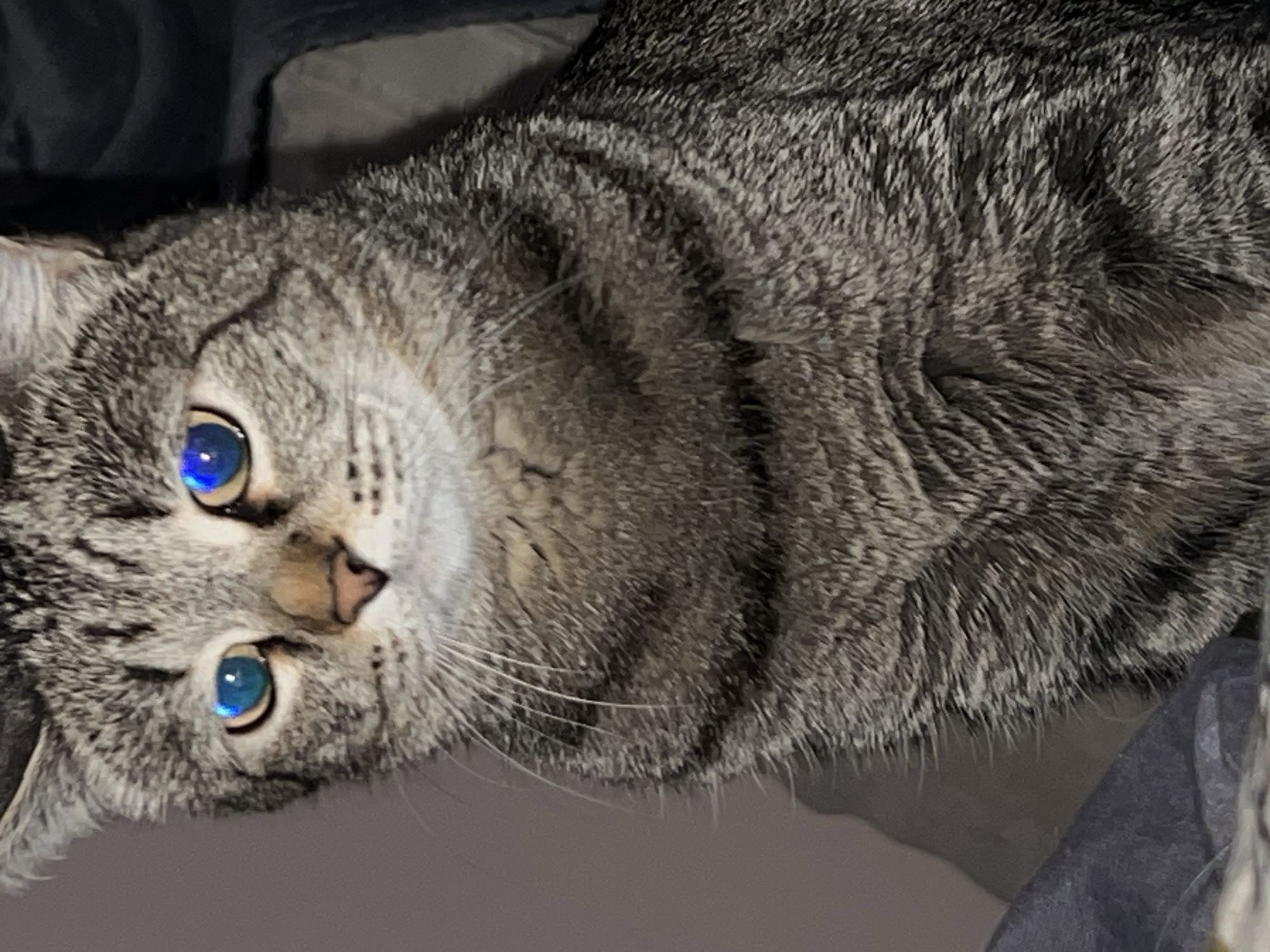 A domestic short-haired cat, exhibiting a tabby fur pattern with shades of grey, black, and brown, is depicted in a medium shot. The cat's eyes display prominent blue reflections, characteristic of tapetum lucidum under direct light or flash photography, with pupils appearing dilated. Its gaze is directed forward, directly toward the viewer. The cat is seated upright, with its chest and head visible, centered in the frame. The immediate environment is an indistinct indoor setting. The background on the left consists of a plain, light grey wall. The background on the right is darker, appearing as a shadowed area or dark fabric. No identifiable objects, individuals, or architectural features are present to determine a specific location within the city of Izhevsk, Russia.