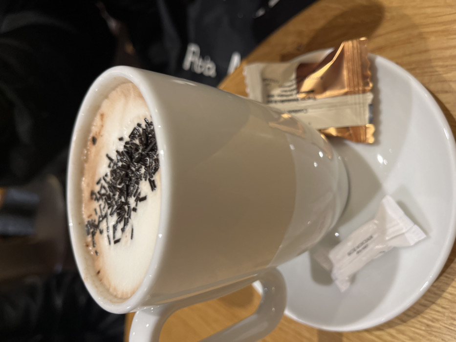 - "An close-up, indoor image depicts a white ceramic mug containing a hot beverage, likely hot chocolate or cappuccino, topped with a layer of white foam and numerous dark brown chocolate sprinkles" by FM-eWTi73, licensed under CC BY 4.0