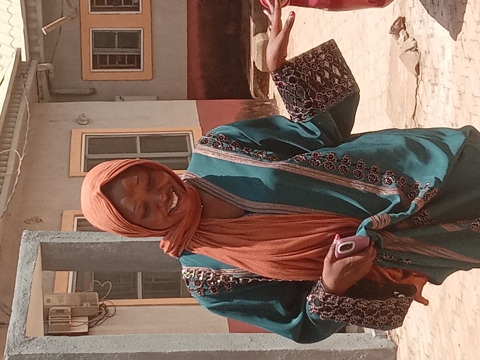 The scene depicts a young woman standing outdoors in the city of Rido, Nigeria, under bright daylight. She is smiling broadly, with her head tilted slightly downwards and to her left. She wears an orange-brown hijab and a loose-fitting, long-sleeved teal garment adorned with dark, intricate embroidered patterns on the cuffs and along the front opening. In her left hand, she holds a pink mobile phone. Her right hand is extended outwards, palm up, fingers slightly splayed, revealing red-painted fingernails. Behind her, a building with light beige walls and a reddish-brown lower section is visible. The structure features multiple rectangular windows with white frames and security grates. To the left, a grey, rectangular archway or column is prominent, with an electrical meter box and associated wiring mounted on the wall above it. The building has a light-colored, possibly corrugated metal, roof with a decorated overhang. The ground is an uneven surface of light-colored earth or concrete with scattered debris. A partial view of a red object or garment is visible on the far right edge of the frame.